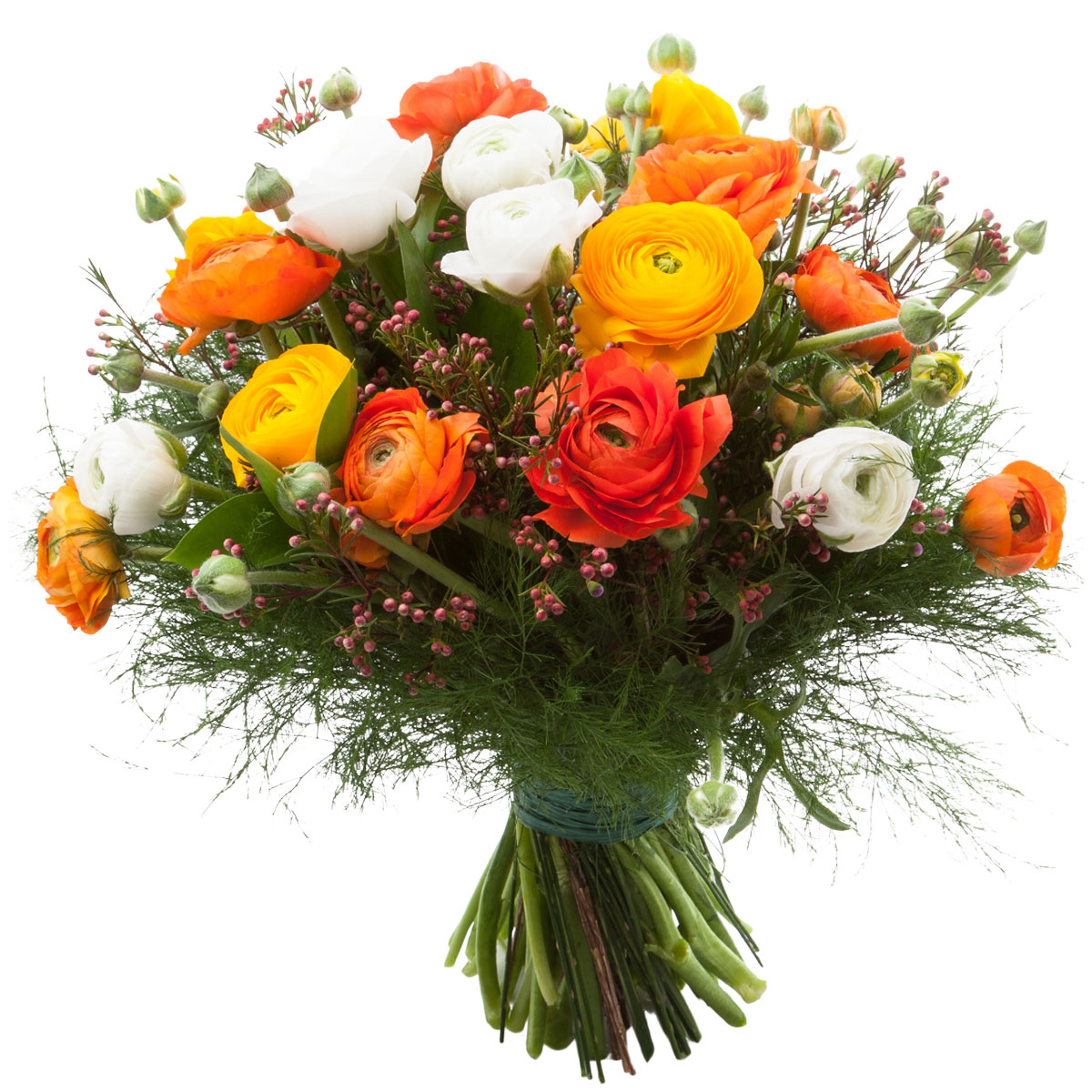 Ранункулюс оранжевый, желтый и белый, зелень. Упаковка (лента, пленка, крафт, сетка, пленка матовая)