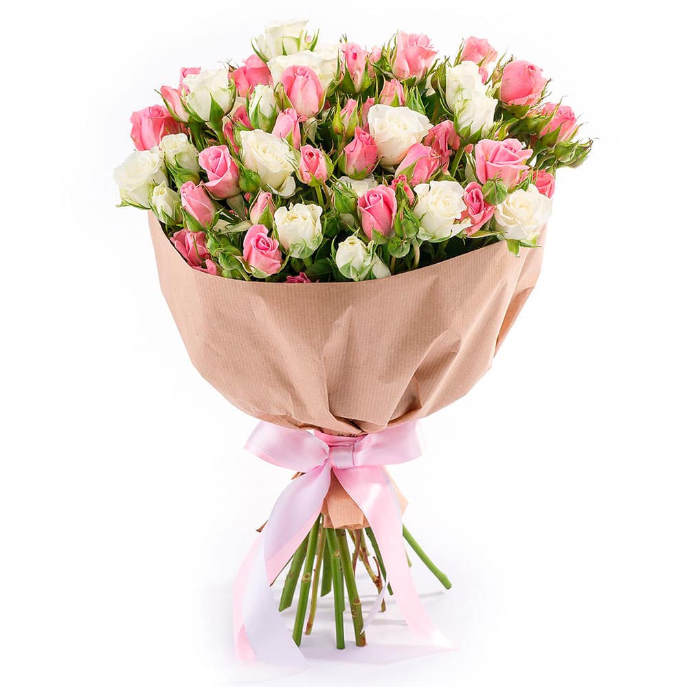 Роза кустовая микс (белая, розовая). Упаковка (лента, пленка, крафт, сетка, пленка матовая)