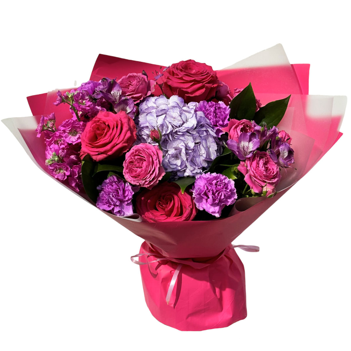 Гортензия фиолетовая, роза одноголовая розовая, гвоздика сиреневая, альстромерия, маттиола. Упаковка (лента, пленка, крафт, сетка, пленка матовая)